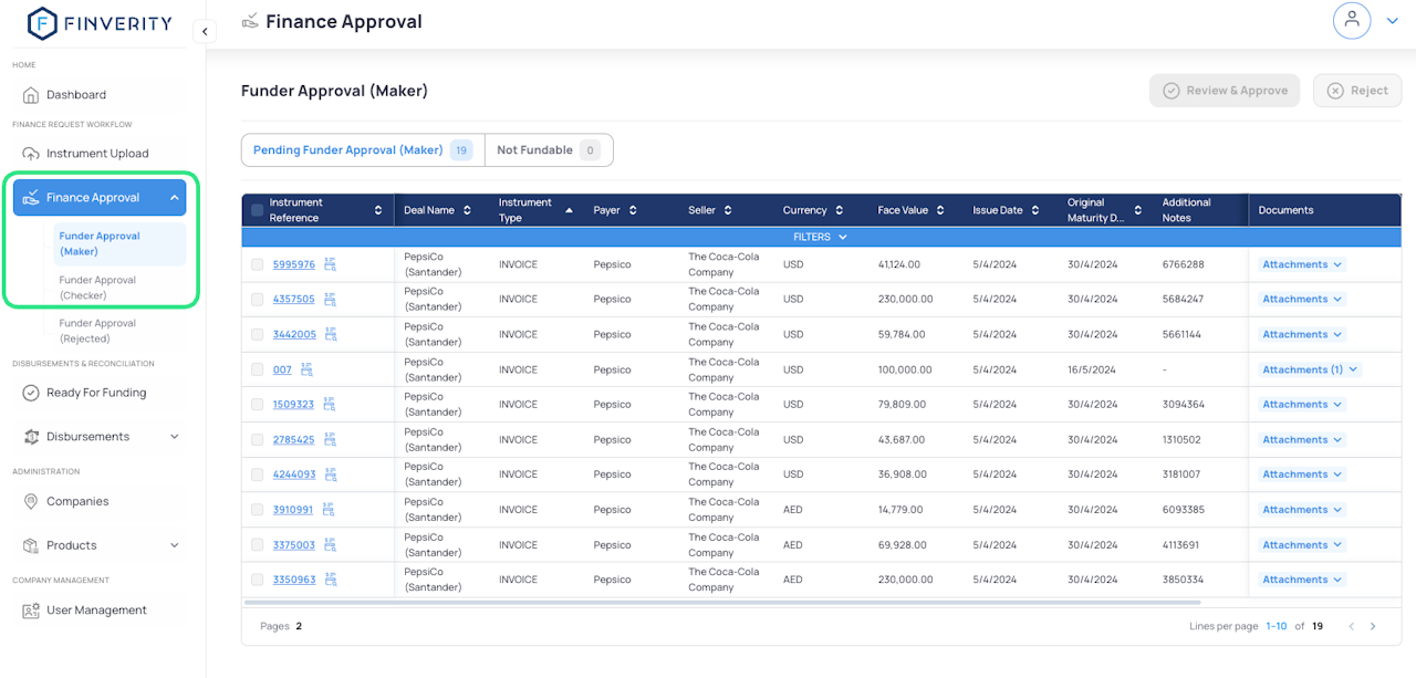 A table view will include all Instruments requiring review and approval on the Deal Manager/Funder side